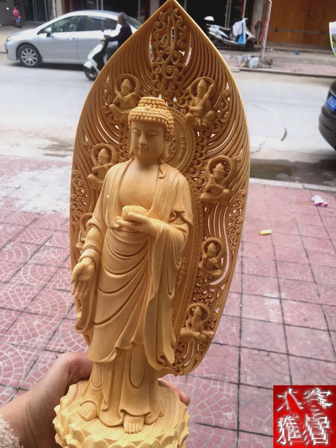 43CM Large --HOME family protection Ornament # TOP Handmade wood carving Lotus Sakyamuni Amitabha M