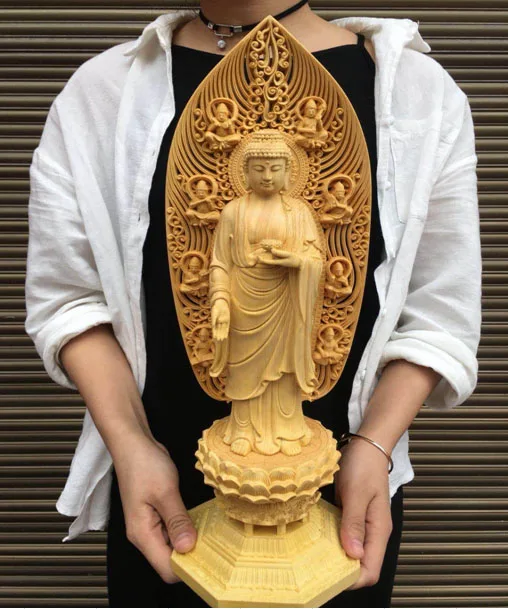 BEST QUALITY 43CM Large --HOME family protection Ornament # TOP Handmade wood carving Lotus Sakyamuni Amitabha M